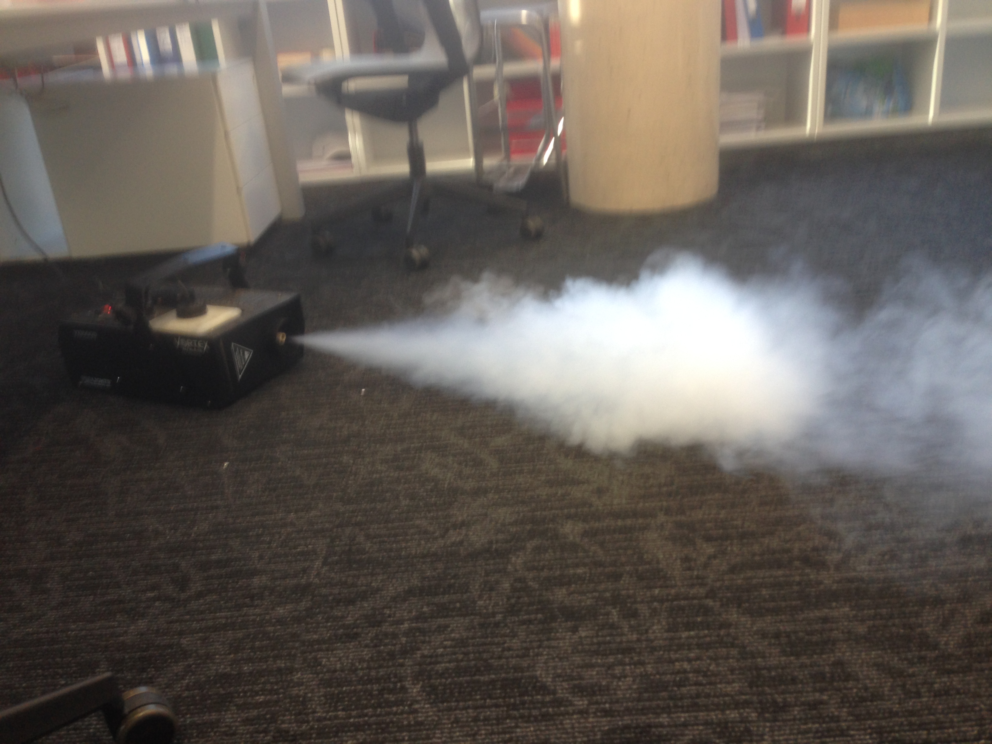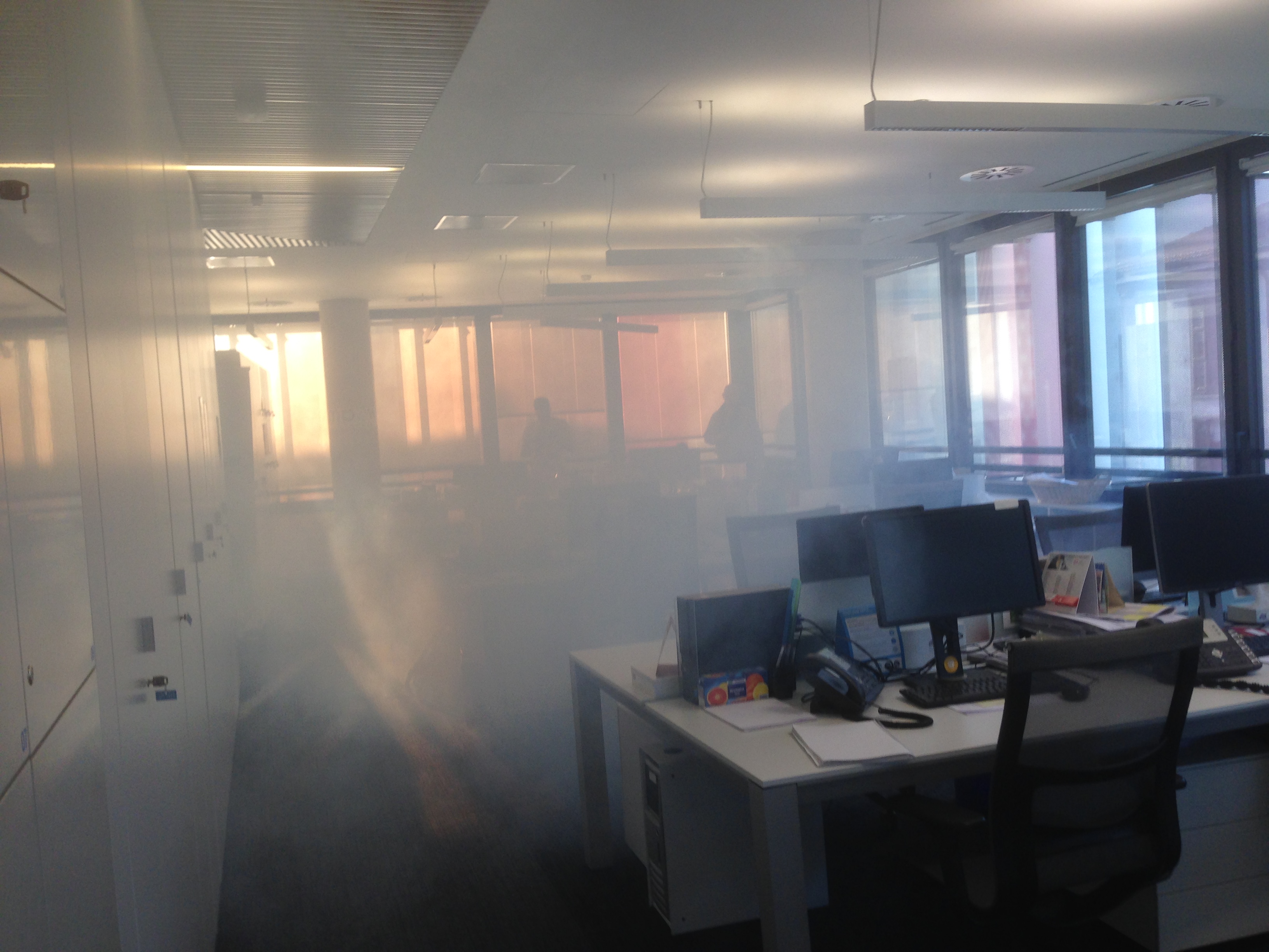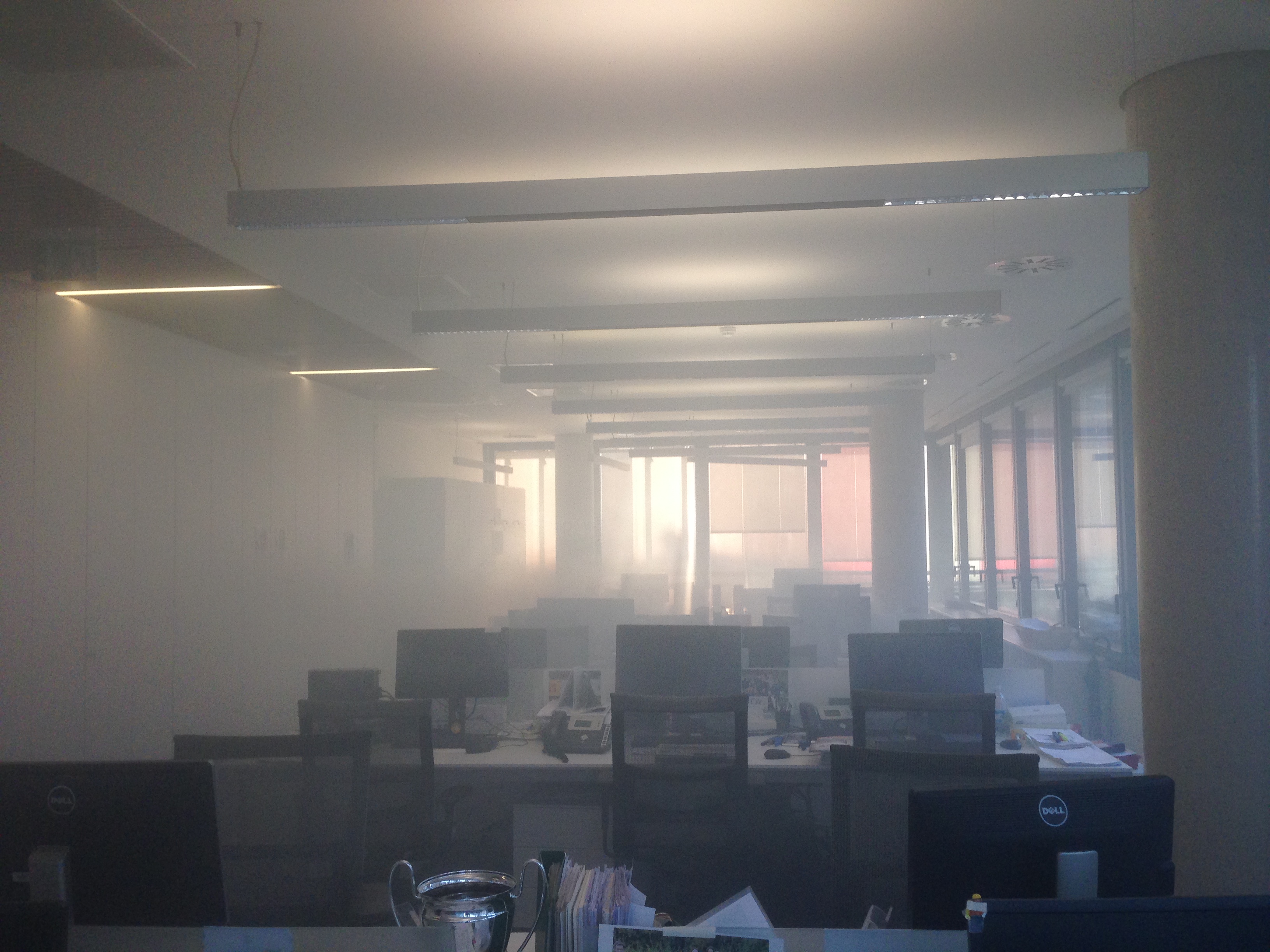 L’esito delle prove, in questo caso, ha evidenziato che il solo funzionamento dell’impianto di rinnovo dell’aria provoca una stratificazione del fumo non consentendo un rapido lavaggio della metà inferiore dell’ambiente. L’accensione dei ventilatori dei fancoil ha invece eliminato la stratificazione dell’aria, consentendo l’evacuazione dei fumi in circa 20 minuti.